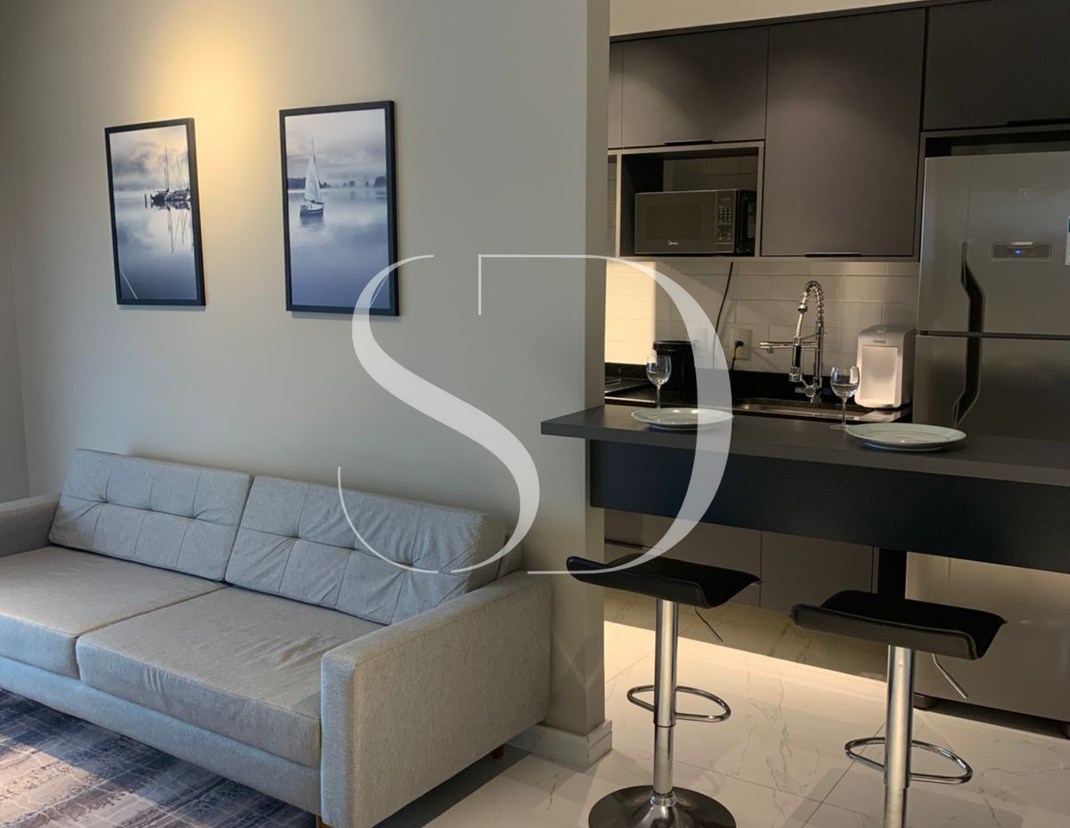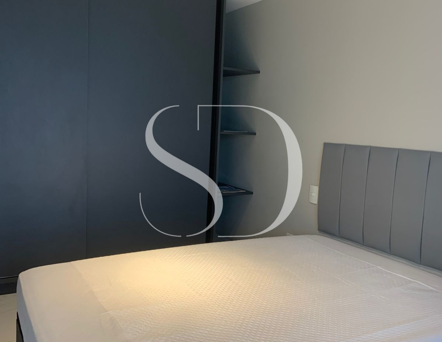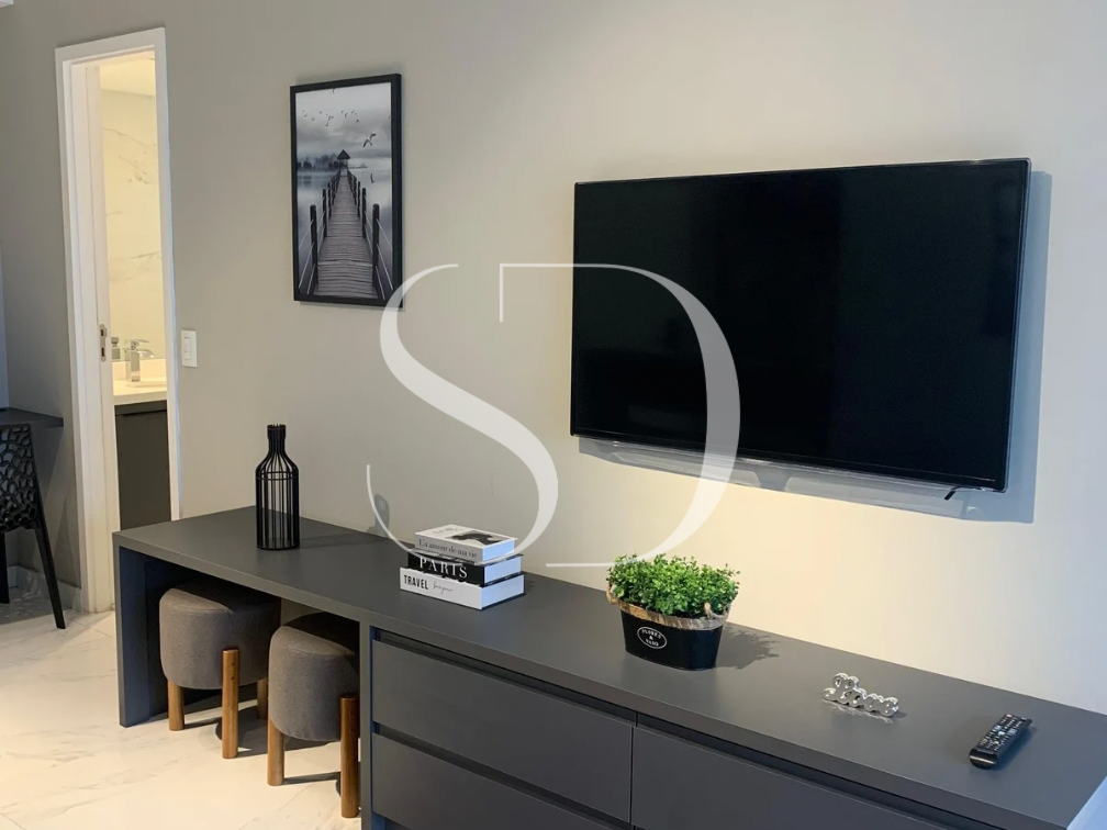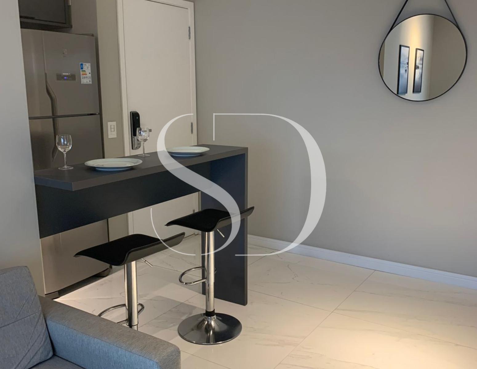 O apartamento possui 52m, planta tipo studio com ambientes integrados e uma excelente varanda.
