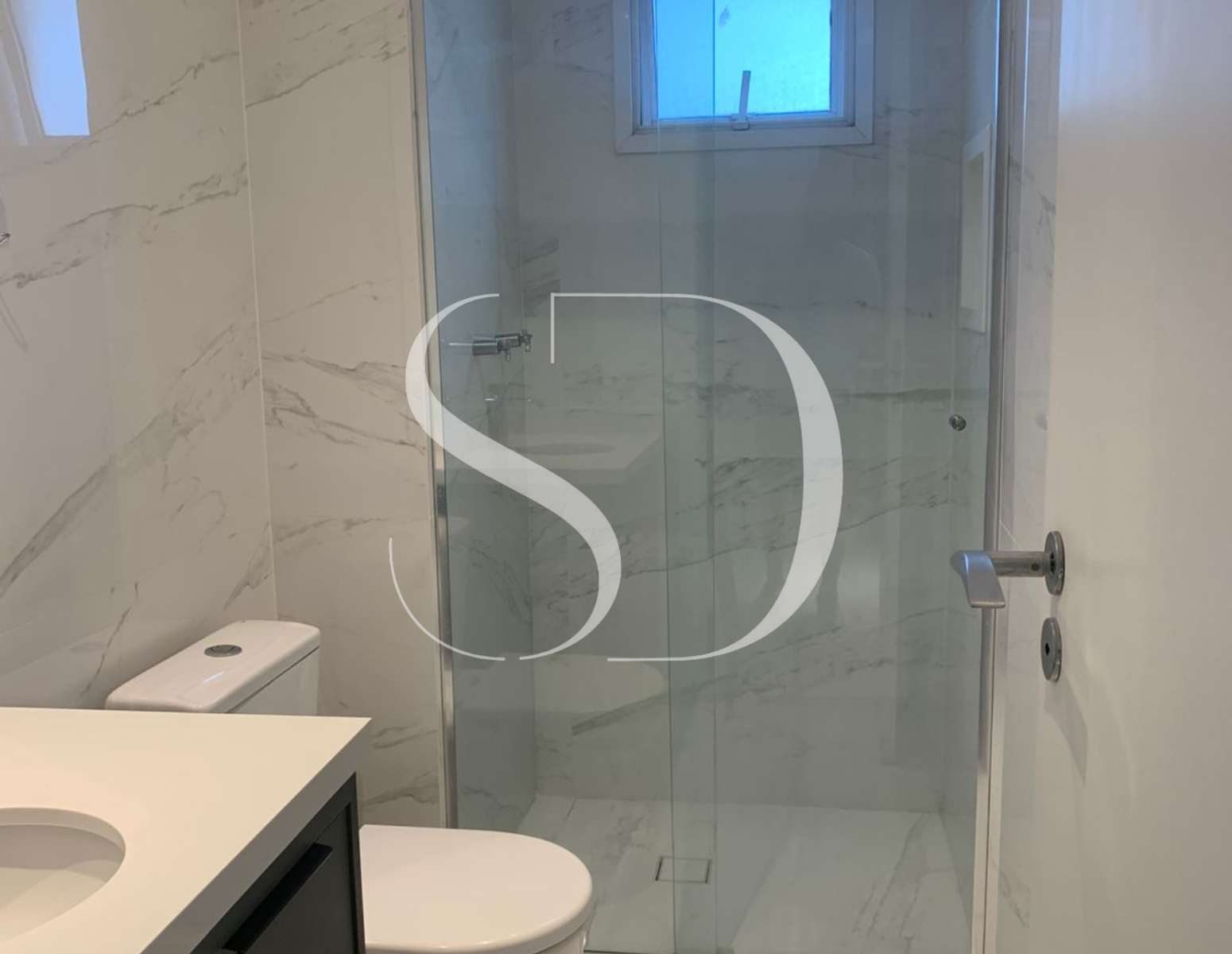 O banheiro possui gabinete moderno e box, garantindo praticidade e elegância.