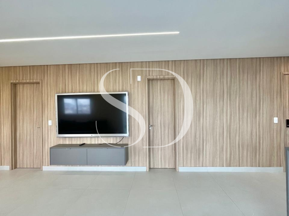 Sala decorada com iluminação de led, lindo e moderno painel ripado, rack planejado, sofa 6 luigares em L, e TV instalada.